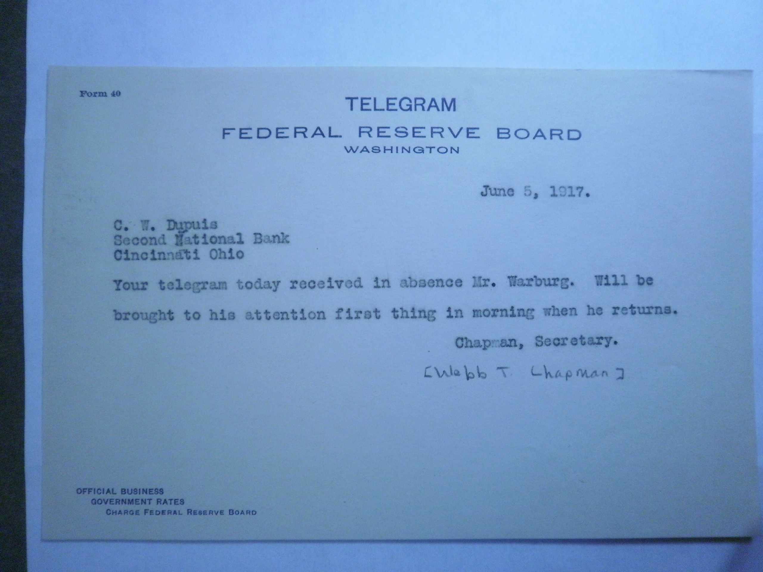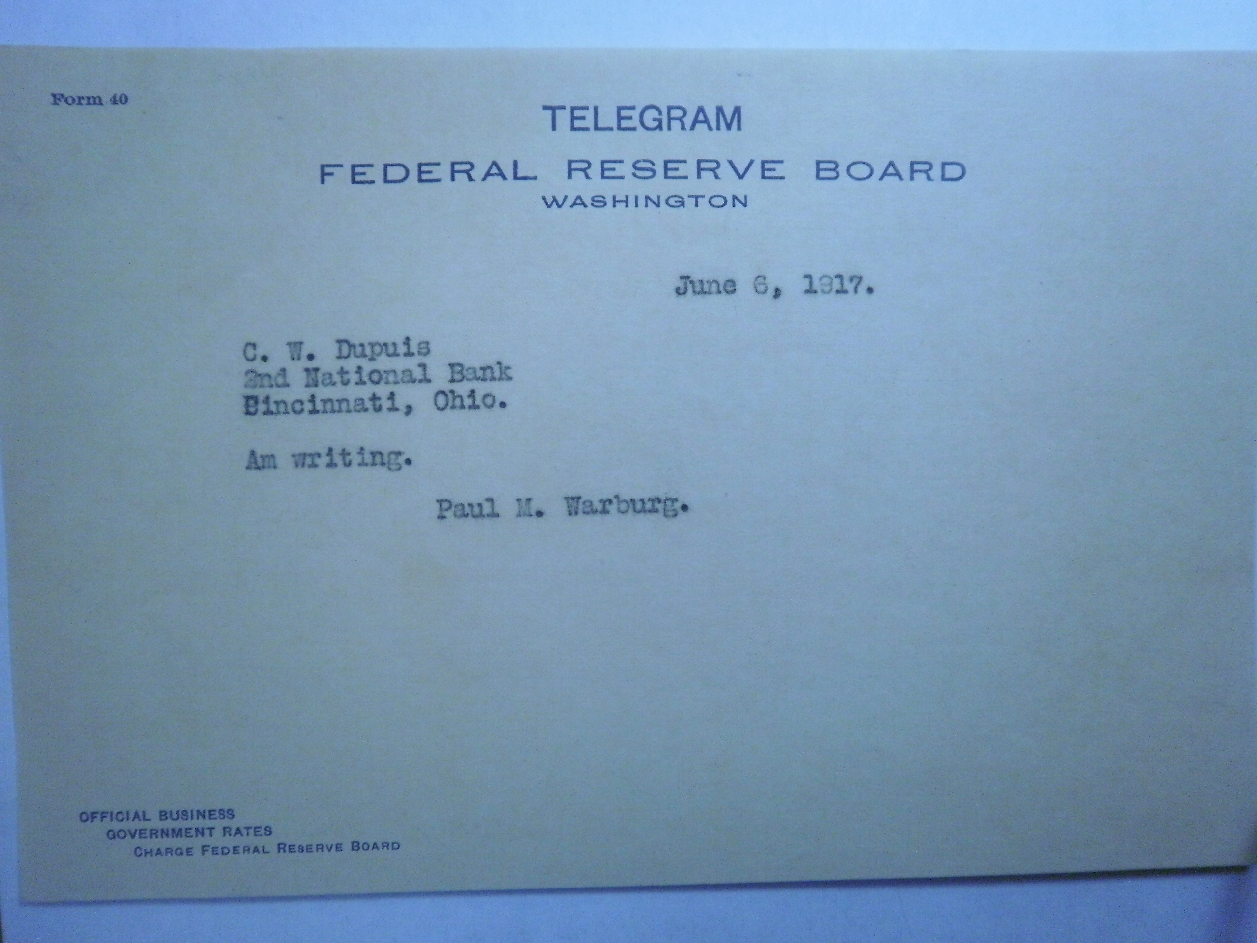 PB230152 6-2-17 telegram W to Dupuis - Second Nat Bk Cincin Ohio.JPG