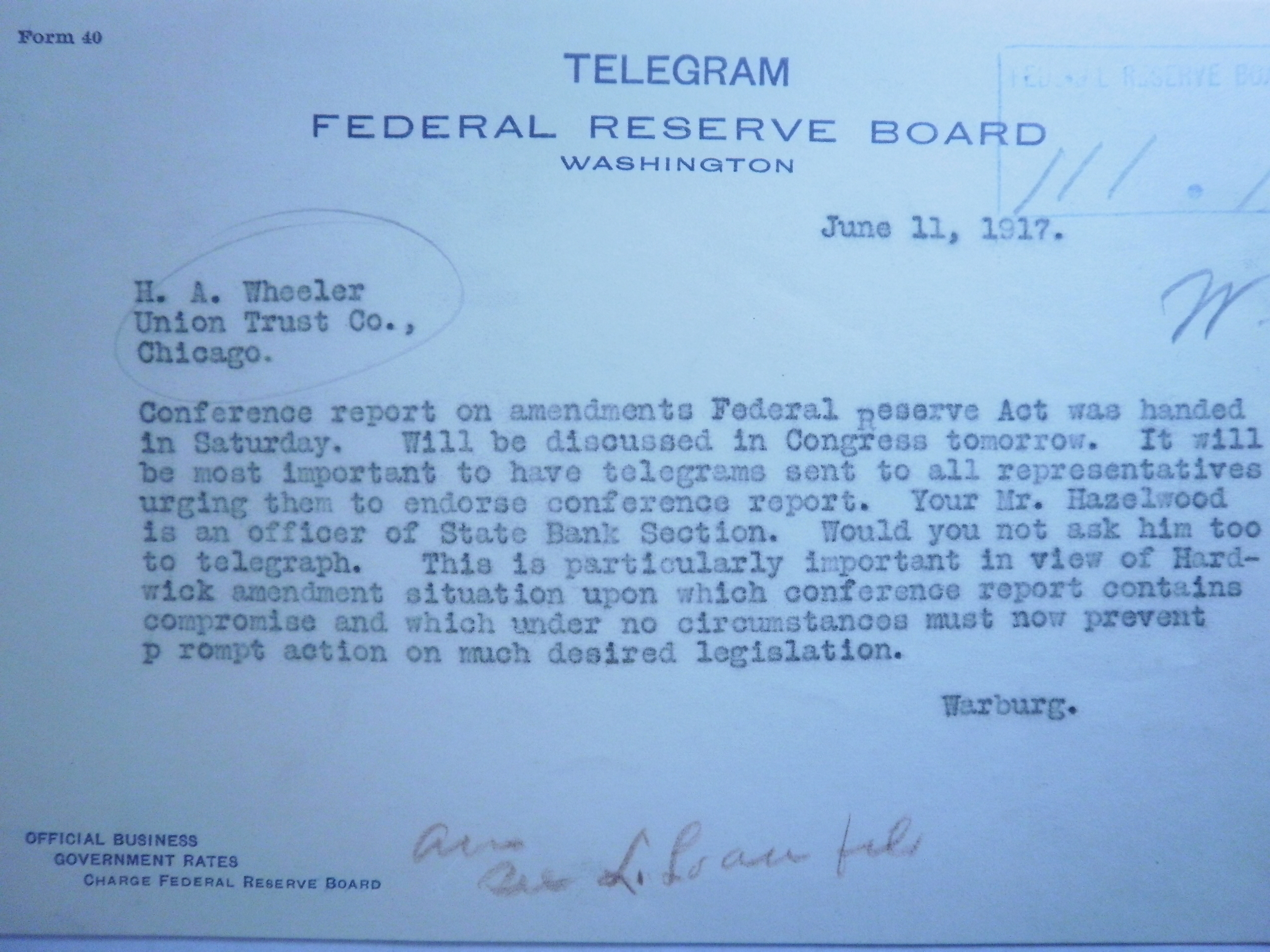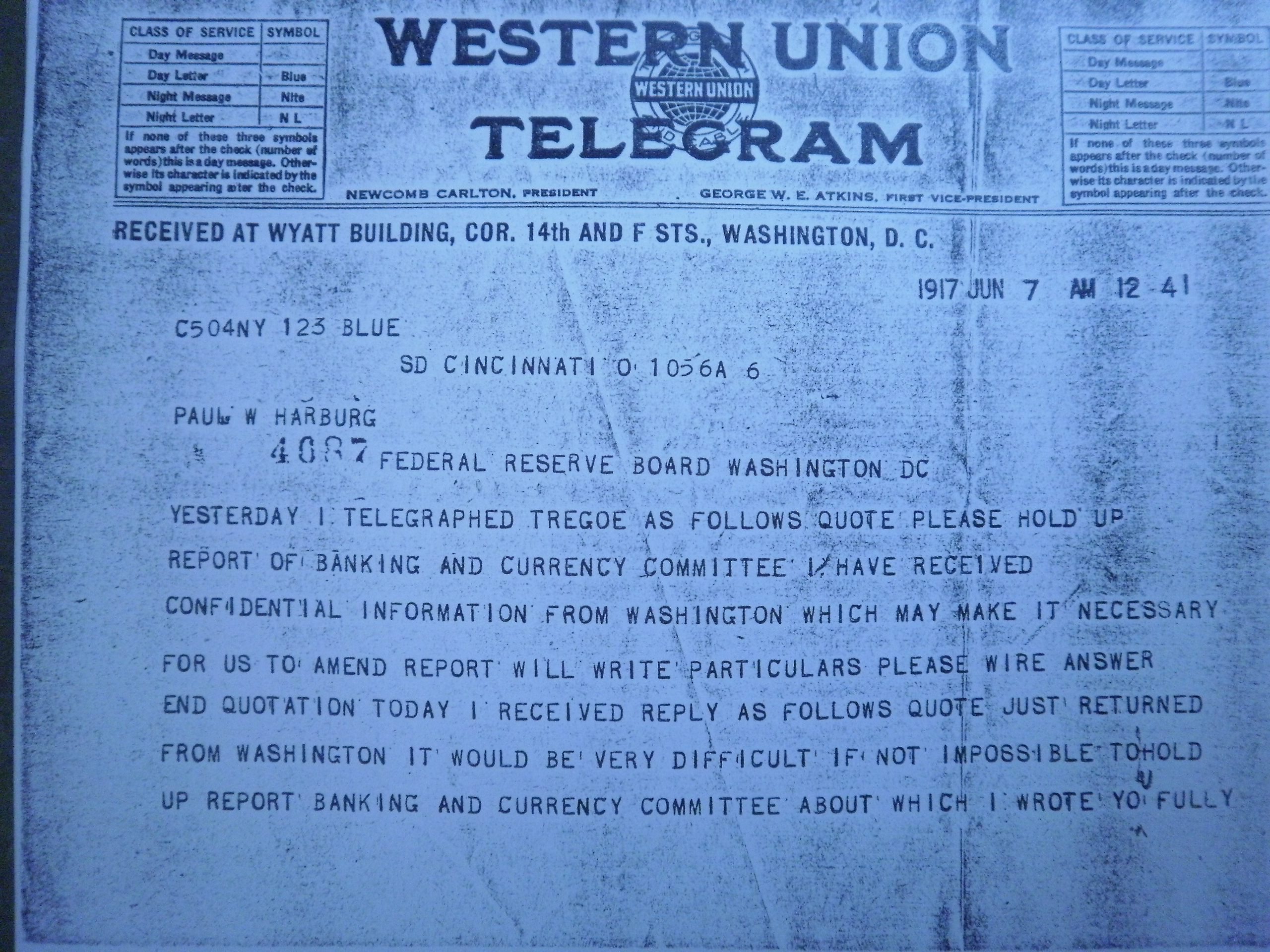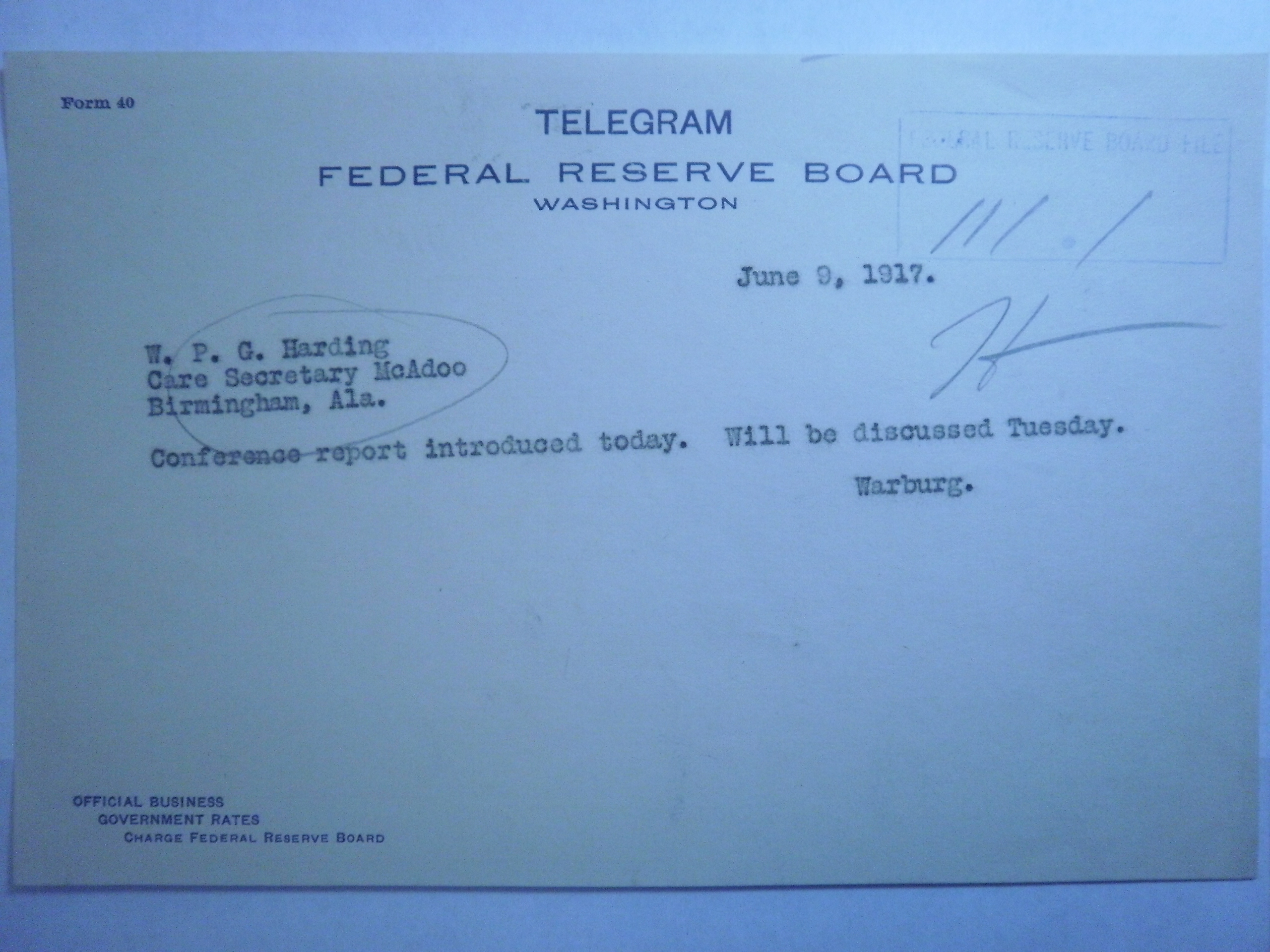 PB240199 6-9-17 TELEGRAM W TO W P G HARDING CHAIR FED RE CONF RPT .JPG